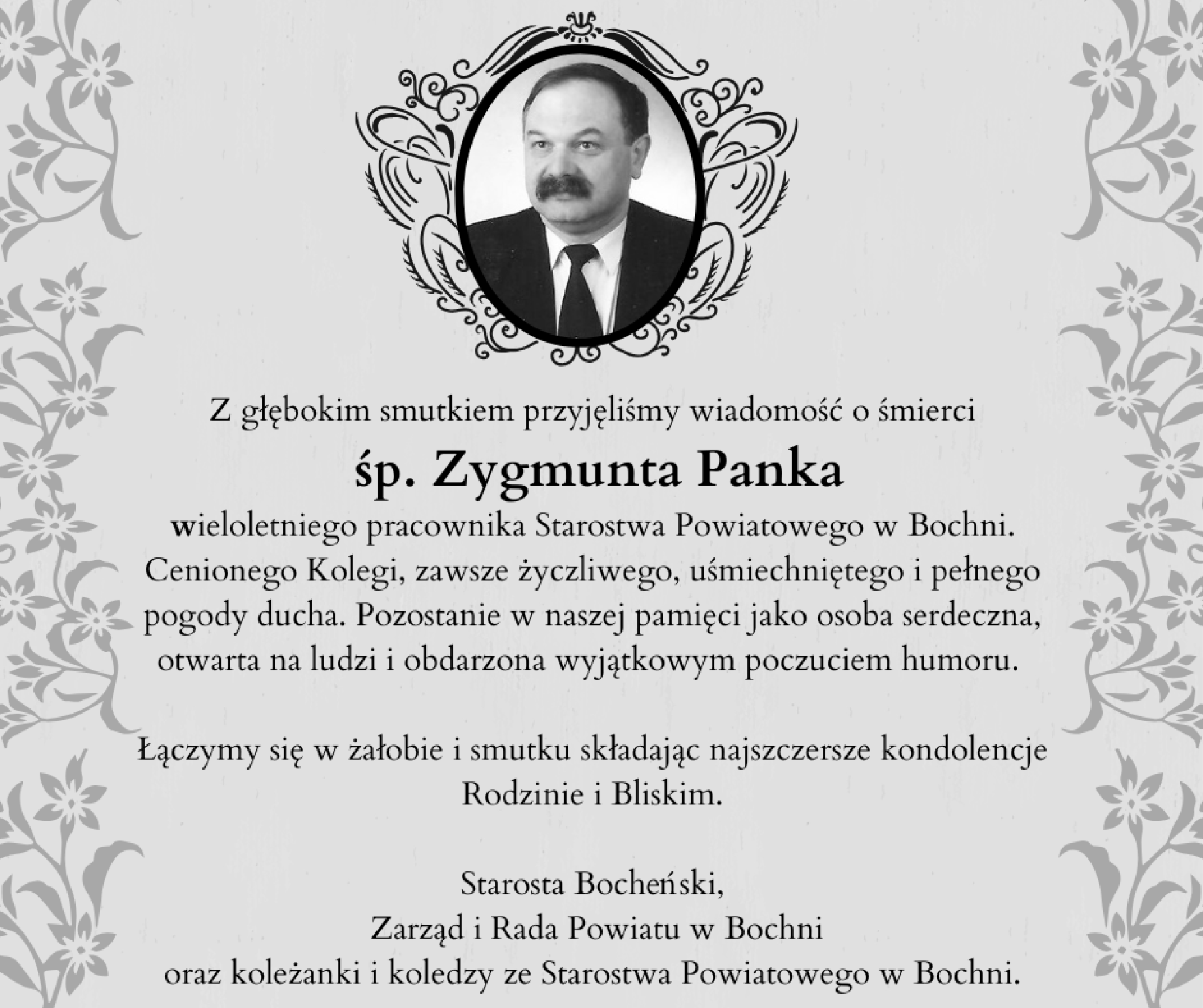 Z głębokim smutkiem przyjęliśmy wiadomość o śmierci śp. Zygmunta Panka - wieloletniego pracownika Starostwa Powiatowego w Bochni. Cenionego Kolegi, zawsze życzliwego, uśmiechniętego i pełnego pogody ducha. Pozostanie w naszej pamięci jako osoba serdeczna, otwarta na ludzi i obdarzona wyjątkowym poczuciem humoru.