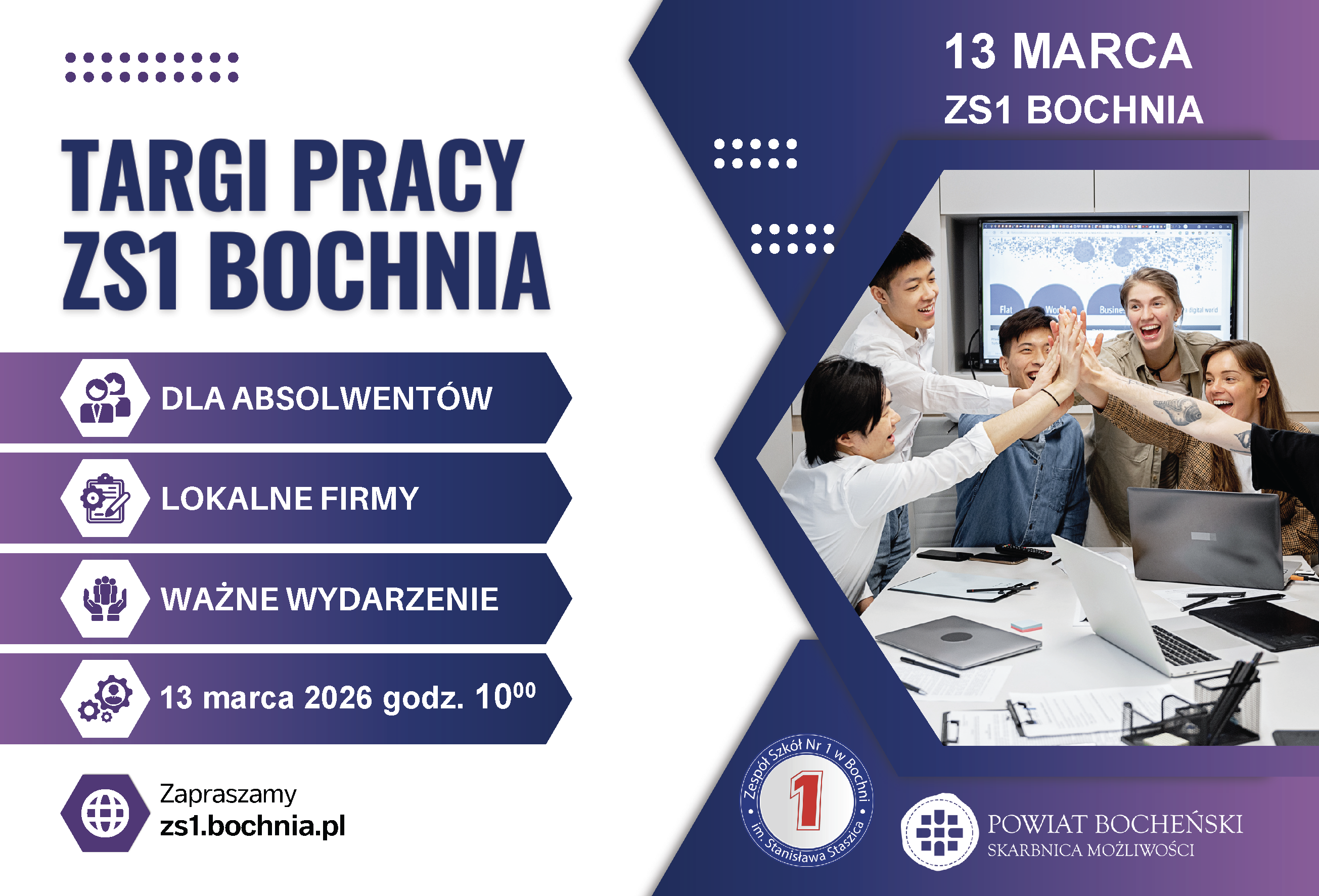 Targi odbędą się 13 marca 2026 roku w Zespole Szkół Nr 1 w Bochni i są organizowane pod patronatem Starosty Bocheńskiego. Inicjatywa na stałe wpisała się w kalendarz wydarzeń wspierających rozwój zawodowy młodych mieszkańców powiatu i z roku na rok cieszy się coraz większym zainteresowaniem uczniów oraz pracodawców.
