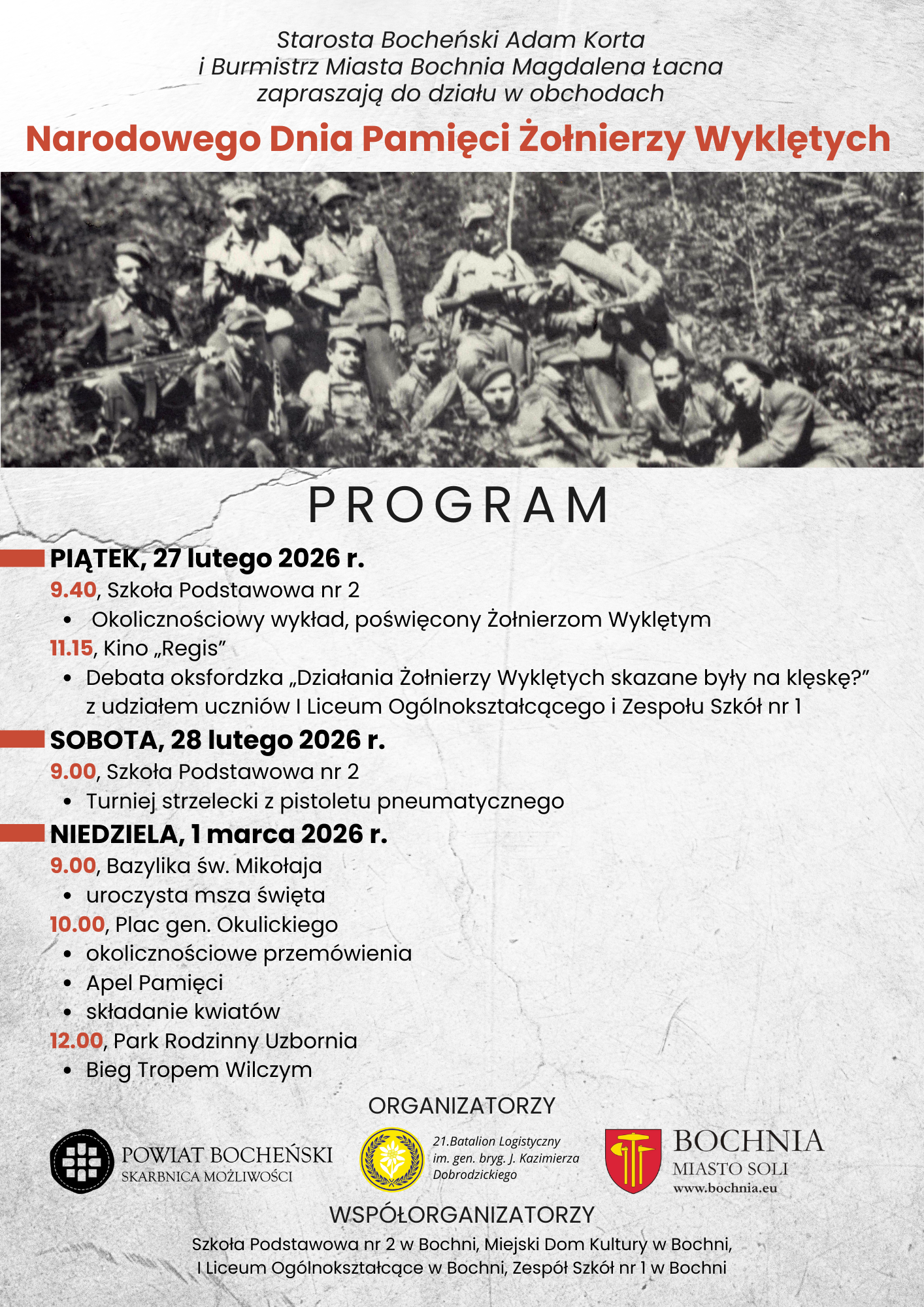 Starosta Bocheński Adam Korta i Burmistrz Miasta Bochnia Magdalena Łacna zapraszają do działu w obchodach Narodowego Dnia Pamięci Żołnierzy Wyklęty.